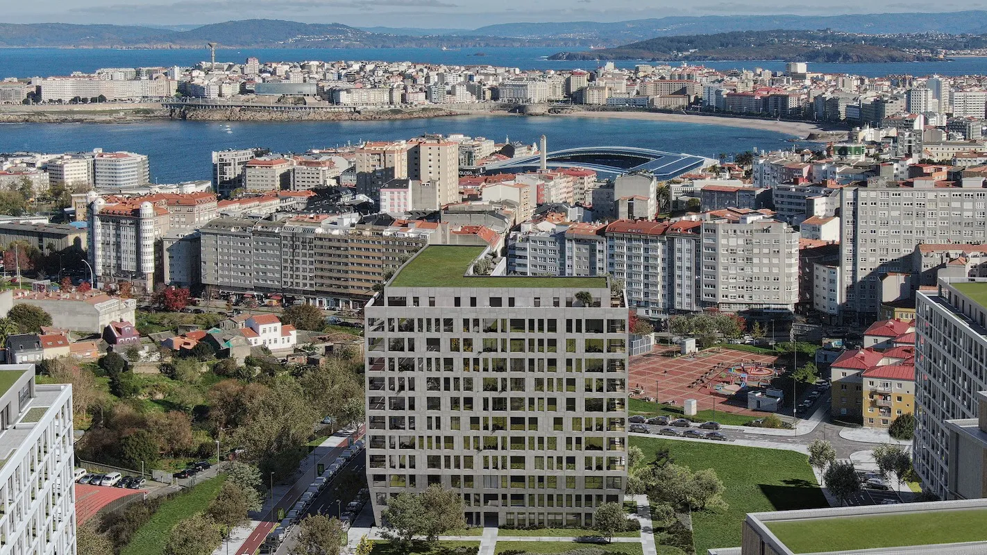 A 800 metros de Riazor, con todas las ventajas de una urbanización: espacios libres, piscina exterior, gimnasio, local gastronómico.